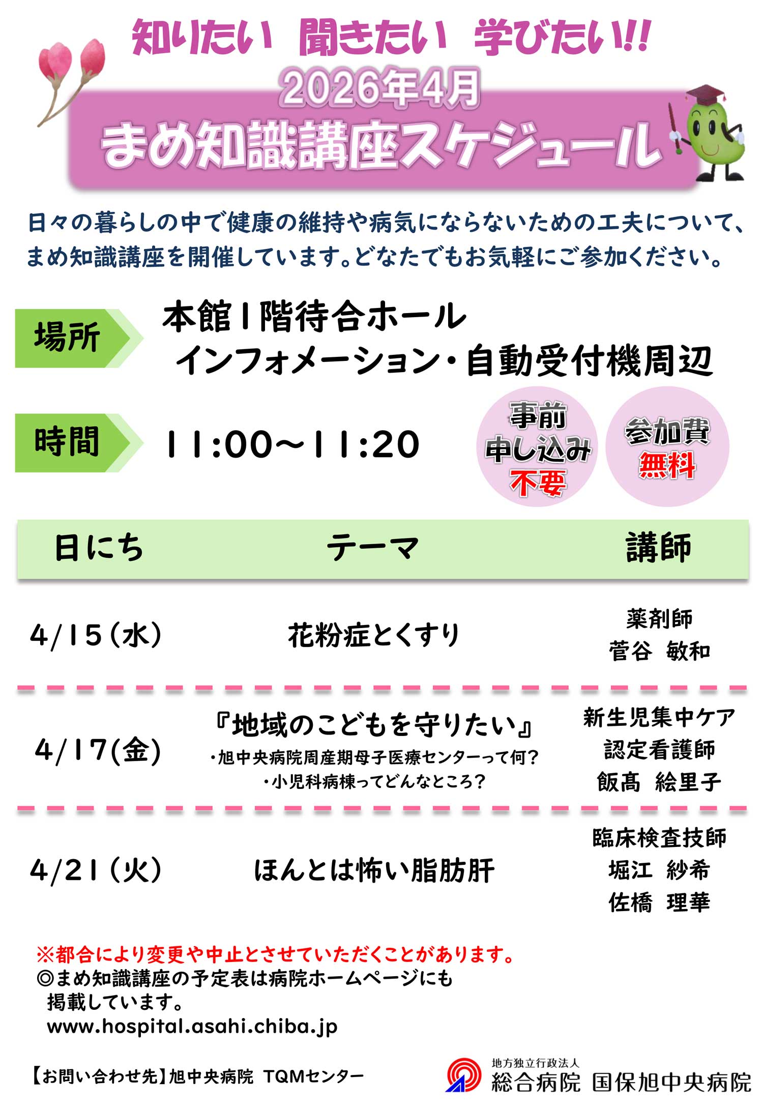 2015年2月より、外来患者さんとそのご家族を対象として、当院の院内横断活動チームのメンバーが講師となり、病気や健康、医療・介護に関する、まめ知識講座を開催しています。
